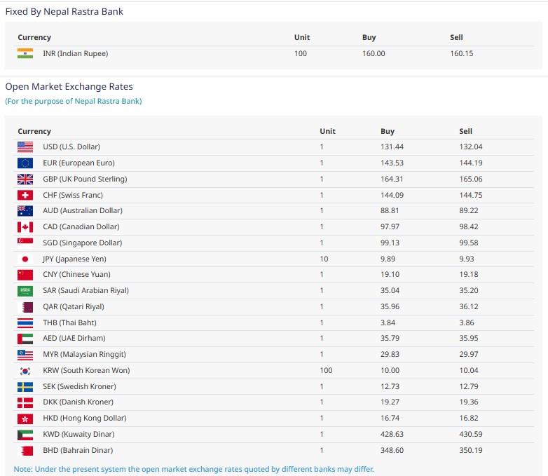 त्यस्तै, बुधबार भारतीय रुपैयाँ एक सयको खरिद दर १६० रुपैयाँ रहेको छ भने बिक्री दर १६१ रुपैयाँ १५ पैसा, युरो एकको खरिद दर १४३ रुपैयाँ ५३ पैसा र बिक्री दर १४४ रुपैयाँ १९ पैसा, बेलायती पाउण्ड एकको खरिद दर १६४ रुपैयाँ ३१ पैसा र बिक्रीदर १६५ रुपैयाँ ०६ पैसा राष्ट्र बैंकले तोकेको छ । आज युरो बेलायती पाउण्ड,अष्ट्रेलियन डलर सबैको मूल्य बढेको छ ।