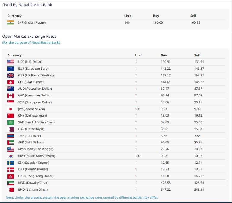 त्यस्तै, बिहीबार भारतीय रुपैयाँ एक सयको खरिद दर १६० रुपैयाँ रहेको छ भने बिक्री दर १६१ रुपैयाँ १५ पैसा, युरो एकको खरिद दर १४३ रुपैयाँ २२ पैसा र बिक्री दर १४३ रुपैयाँ ८७ पैसा, बेलायती पाउण्ड एकको खरिद दर १६३ रुपैयाँ १७ पैसा र बिक्रीदर १६३ रुपैयाँ ९१ पैसा राष्ट्र बैंकले तोकेको छ ।