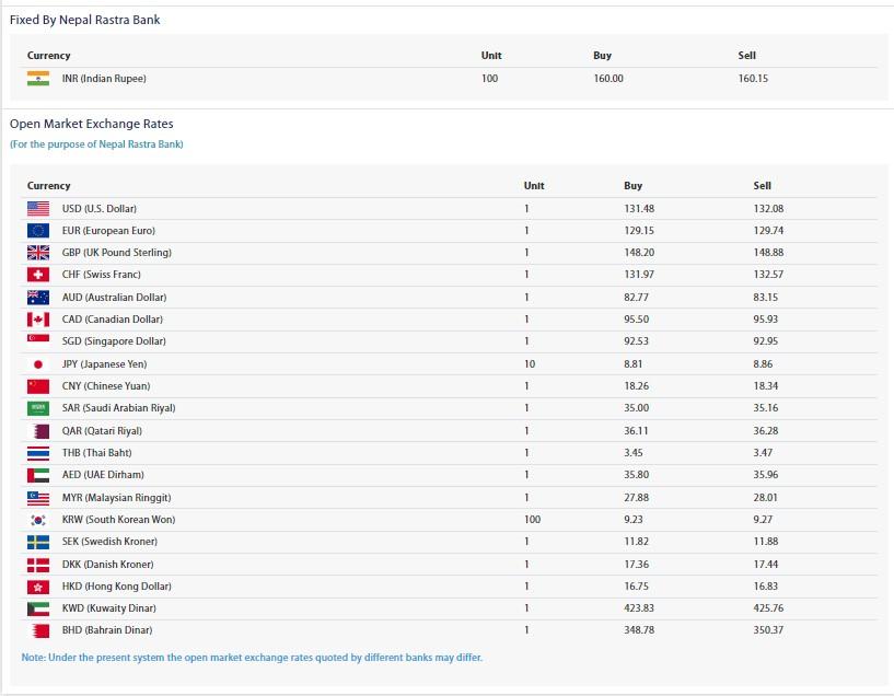 त्यस्तै बुधबार युरोपियन युरो एकको खरिद मूल्य १२९रुपैयाँ १५ पैसा र बिक्रीमा १२९ रुपैयाँ ५४ पैसा, अष्ट्रेलियन डलर एकको खरिद दर ८२ रुपैयाँ ७७ पैसा र बिक्री दर ८३ रुपैयाँ १५ पैसा, क्यानेडियन डलर एकको खरिद दर ९५ रुपैयाँ ५० पैसा र बिक्री दर ९५ रुपैयाँ ९३ पैसा, बेलायती पाउण्ड स्टर्लिङ एकको खरिद दर आज १४८ रुपैयाँ २० पैसा र बिक्रीदर १४८ रुपैयाँ ८८ पैसा तोकिएको छ। साथै कुवेती दिनार एकको खरिद दर ४२३ रुपैयाँ ८६पैसा र बिक्री दर ४२५ रुपैयाँ ७६ पैसा, बहराइन दिनार एकको खरिद दर ३४८ रुपैयाँ ७८ पैसा र बिक्रीदर ३५० रुपैयाँ ३७ पैसा तोकिएको छ।