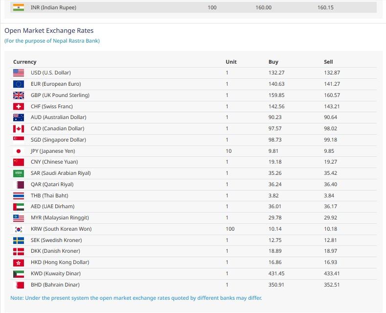 त्यस्तै, आज युरो एकको खरिद मूल्य १४० रूपैयाँ ६३ पैसा र बिक्री मूल्य १४१रूपैयाँ २७ पैसा, भारतीय रूपैयाँ एक सयको खरिद दर १६० रूपैयाँ रहेको छ भने बिक्री दर १६० रूपैयाँ १५ पैसा, बेलायती पाउण्ड एकको खरिदमूल्य १५९ रूपैयाँ ८५ पैसा र बिक्रीमूल्य १६० रूपैयाँ ५७ पैसा, अष्ट्रेलियन डलरको खरिद दर ९० रूपैयाँ २३ पैसा र बिक्रीदर ९० रूपैयाँ ६४ पैसा राष्ट्र बैंकले कायम गरेको छ ।
