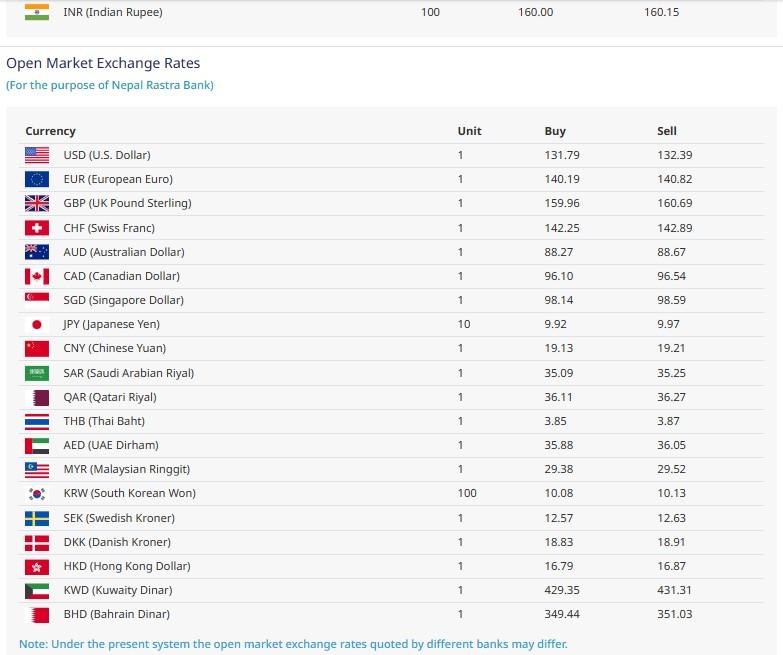 त्यस्तै, आज भारतीय रुपैयाँ एक सयको खरिद दर १६० रुपैयाँ रहेको छ भने बिक्री दर १६० रुपैयाँ १५ पैसा, युरो एकको खरिद दर १४० रुपैयाँ १९ पैसा र बिक्री दर १४० रुपैयाँ ८२ पैसा बेलायती पाउण्ड एकको खरिद दर १५९ रुपैयाँ ९६ पैसा र बिक्री दर १६० रुपैयाँ ६९ पैसा रहेको छ ।