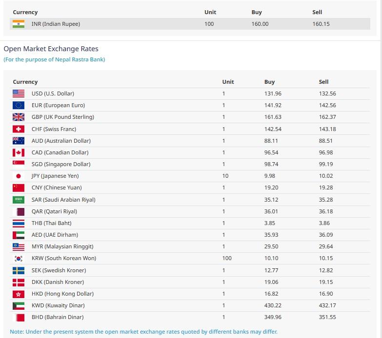त्यस्तै, आज भारतीय रुपैयाँ एक सयको खरिद दर १६० रुपैयाँ रहेको छ भने बिक्री दर १६१ रुपैयाँ १५ पैसा, युरो एकको खरिद दर १४१ रुपैयाँ ९२ पैसा र बिक्री दर १४२ रुपैयाँ ५६ पैसा, बेलायती पाउण्ड एकको खरिद दर १६१ रुपैयाँ ६३ पैसा र बिक्री दर १६२ रुपैयाँ ३७ पैसा राष्ट्र बैंकले तोकेको छ ।