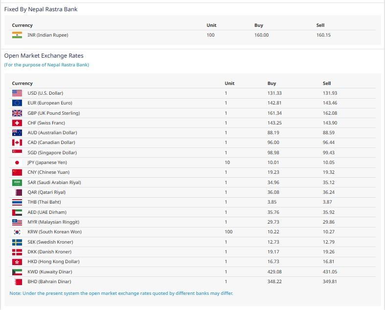 त्यस्तै, आज भारतीय रुपैयाँ एक सयको खरिद दर १६० रुपैयाँ रहेको छ भने बिक्री दर १६१ रुपैयाँ १५ पैसा, युरो एकको खरिद दर १४२ रुपैयाँ ८१ पैसा र बिक्री दर १४३रुपैयाँ ४६पैसा, बेलायती पाउण्ड एकको खरिद दर १६१ रुपैयाँ ६४ पैसा र बिक्री दर १६२ रुपैयाँ ०८ पैसा राष्ट्र बैंकले तोकेको छ । बिहीबार बेलायती पाउण्ड घटेको छ भने युरोको मूल्य पुनः बढेको छ ।