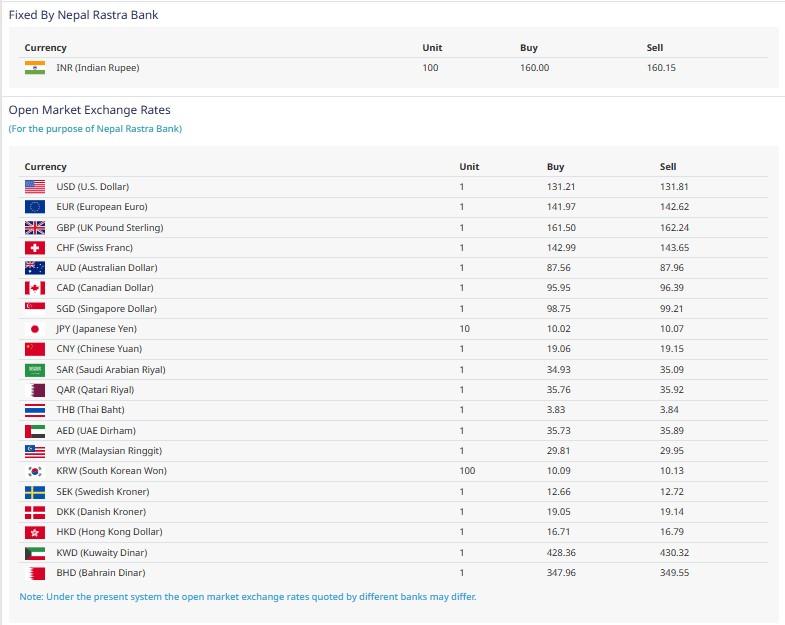 त्यस्तै, आज भारतीय रुपैयाँ एक सयको खरिद दर १६० रुपैयाँ रहेको छ भने बिक्री दर १६१ रुपैयाँ १५ पैसा, युरो एकको खरिद दर १४१ रुपैयाँ ९७ पैसा र बिक्री दर १४२ रुपैयाँ ६२ पैसा, बेलायती पाउण्ड एकको खरिद दर १६१ रुपैयाँ ५० पैसा र बिक्रीदर १६२ रुपैयाँ २४ पैसा राष्ट्र बैंकले तोकेको छ । मंगलबारको तुलनमा बुधबार युरो र बेलायती पाउण्डको मूल्य बढेको छ ।