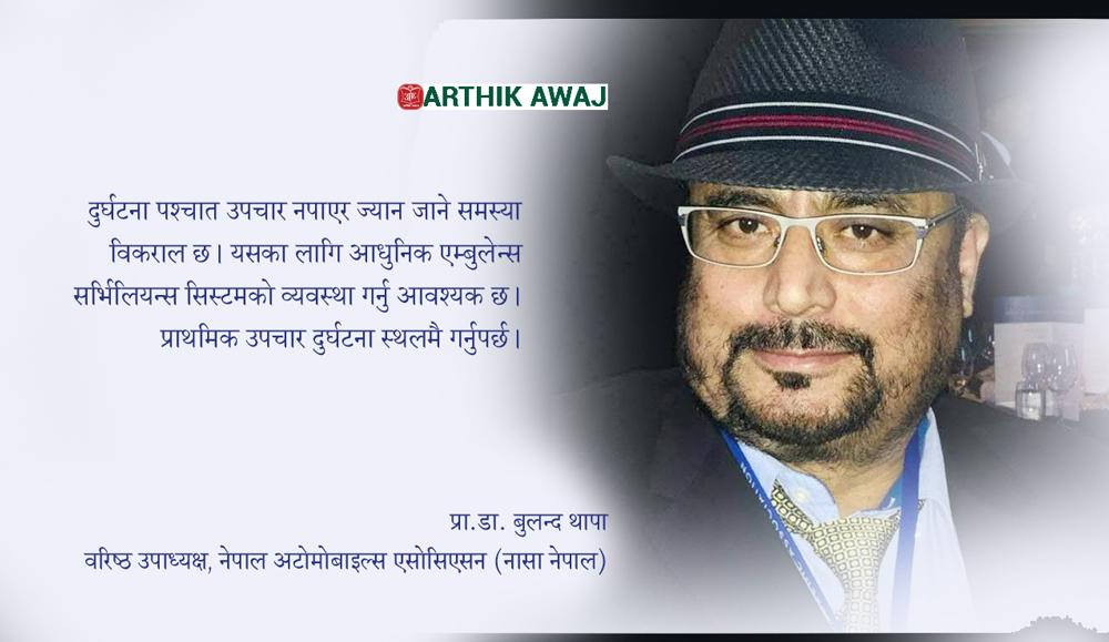 सडक दुर्घटनाका कारण अकालमा ज्यान जाने क्रम बढ्दो छ । दुर्घटना पश्चात उपचार नपाएर ज्यान जाने समस्या पनि विकराल छ । तर यतातिरको तथ्यांकमा कमैको मात्र ध्यान जाने गरेको छ । यसका लागि आधुनिक एम्बुलेन्स सर्भिलियन्स सिस्टमको व्यवस्था गर्नु आवश्यक छ । प्राथमिक उपचार दुर्घटना स्थलमै गर्नुपर्छ । क्विक रेस्पोन्सका लागि आवश्यक प्राविधिक जनशक्तिको व्यवस्था पनि हुनुपर्छ ।