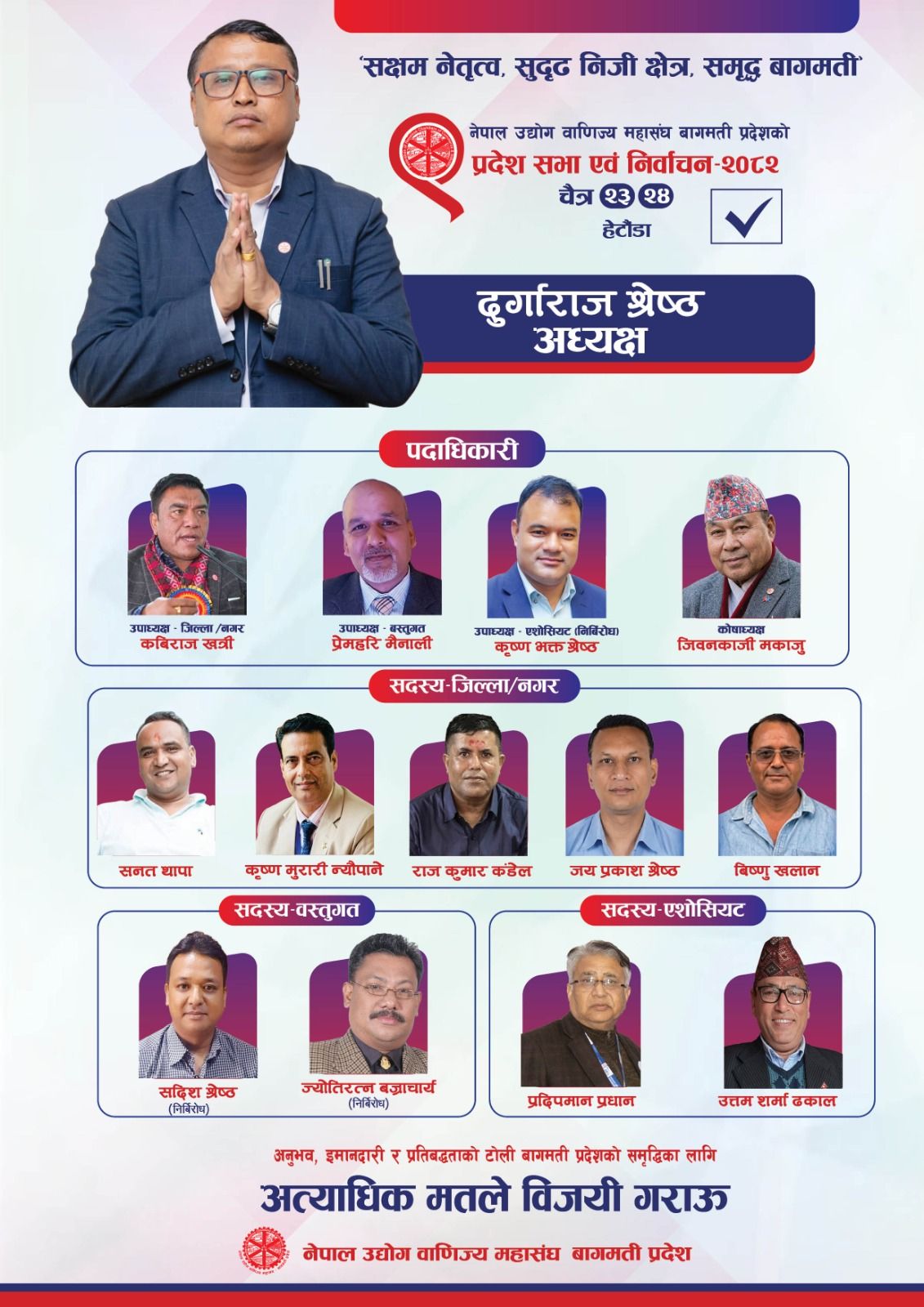 उनको प्यानलबाट जिल्ला नगरतर्फ उपाध्यक्षमा कबिराज खत्रीले उम्मेदवारी दिएका छन् । बस्तुगत उपाध्यक्षमा प्रेमहरि मैनालीको उम्मेदवारी छ । एसोसिएट उपाध्यक्षमा कृष्णभक्त श्रेष्ठ निर्विरोध निर्वाचित भइसकेका छन् । कोषाध्यक्षमा जीवनकाजी माकाजूको उम्मेदवारी छ ।