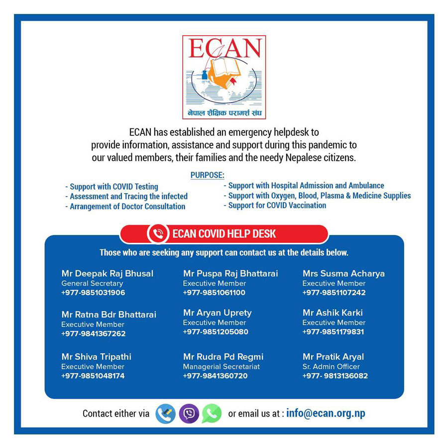 काठमाडौं । कोरोना महामारीको विद्यमान अवस्थालाई मध्यनजर गरी नेपाल शैक्षिक परामर्श संघ (इक्यान)ले कोभिड हेल्प डेस्क स्थापना गरेको छ । हेल्प डेस्कले इक्यानका सदस्य, परिवार लगायत नेपाली नागरिकलाई कोभिड सम्बन्धी विभिन्न जानकारी तथा सहायताको लागि सहयोग पुग्ने इक्यानका अध्यक्ष प्रकाश पाण्डेले बताए ।