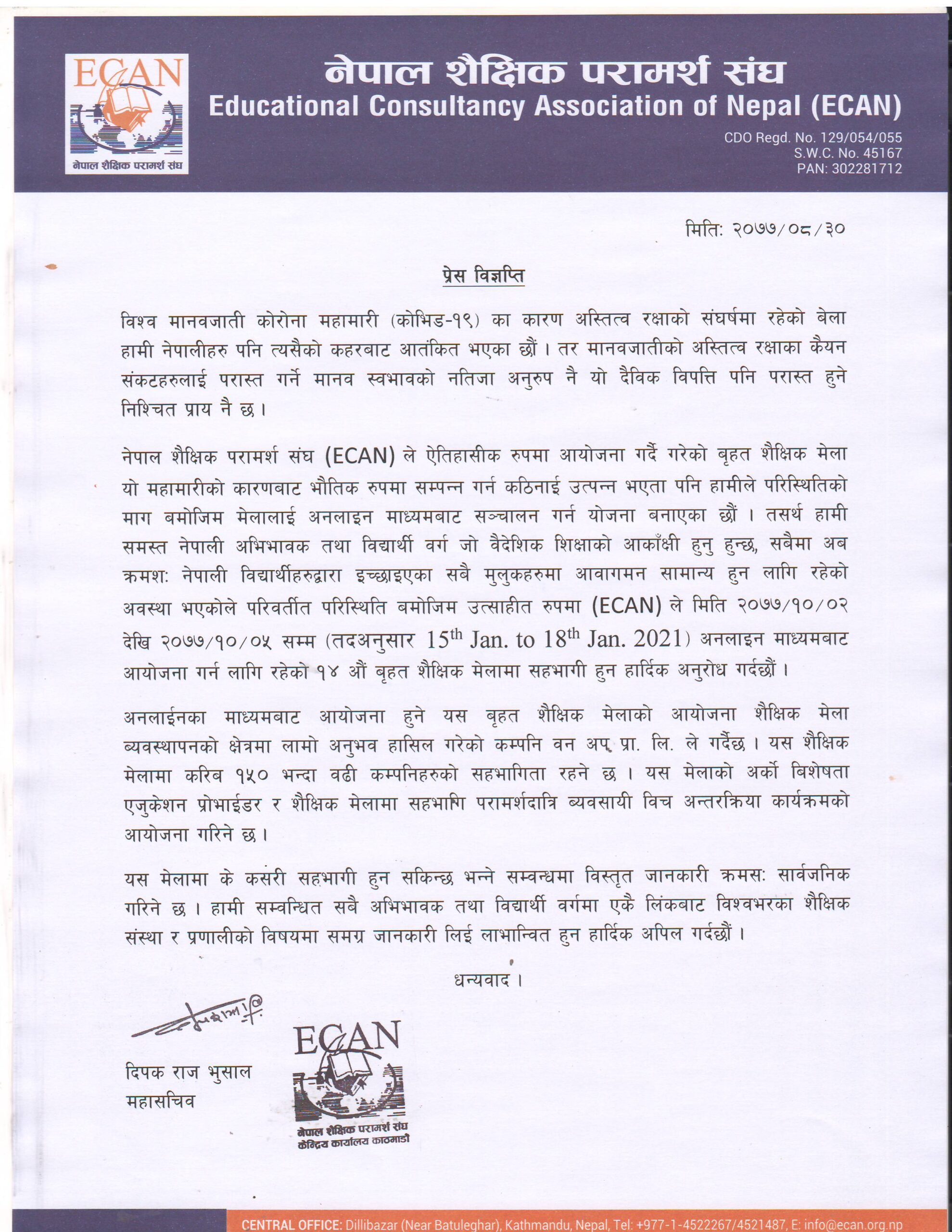 कोरोना भाइरसको महामारीका कारण भौतिक रुपमा उपस्थित हुने अवस्था नरहेकाले अनलाइन मार्फत बृहत शैक्षिक मेला आयोजना गरी सम्पूर्ण जानकारी दिन लागिएको इक्यानका अध्यक्ष प्रकाश पाण्डेले जानकारी दिए । अनलाइन मार्फत शैक्षिक मेला गरेर भए पनि विद्यार्थी, अभिभावक लगायतलाई जानकारी दिने उद्देश्य इक्यानको छ । अध्यक्ष पाण्डेका अनुसार अनलाइन मेलामा उच्च शिक्षाका लागि विदेश जान चाहने विद्यार्थी, उनीहरुका अभिभावक तथा सरोकारवाला पक्षहरुले सहभागी भइ विभिन्न प्रकारका शैक्षिक जानकारी लिन र जिज्ञाशा मेट्न सक्नेछन् ।