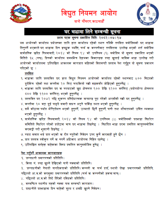 सूचनामा इच्छुक घरधनी वा संस्थाले भवनकाे सम्पूर्ण विवरण, नक्सा, तस्बिर, क्षेत्रफल, भाडादर प्रस्ताव तथा सम्बन्धित कागजातसहित ७ दिनभित्र प्रस्ताव पेश गर्नुपर्ने उल्लेख गरिएको छ । आयोगले प्राप्त प्रस्तावहरूको मूल्यांकन तथा भवन निरीक्षण गरी आवश्यक कानुनी प्रक्रिया पूरा भएपछि भाडा सम्झौता गर्ने जनाएको छ ।