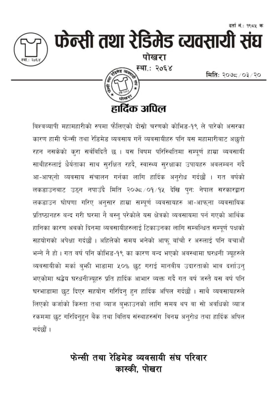 पोखरा । फेन्सी तथा रेडिमेड व्यवसायी संघ पोखराले घरधनी र बैंक तथा वित्तीय संस्थासँग लकडाउन अवधिको घरभाडा र व्याज रकममा छुट दिन आग्रह गरेको छ । संघले आईतबार विज्ञप्ती जारी गरी सो माग गरेको हो ।