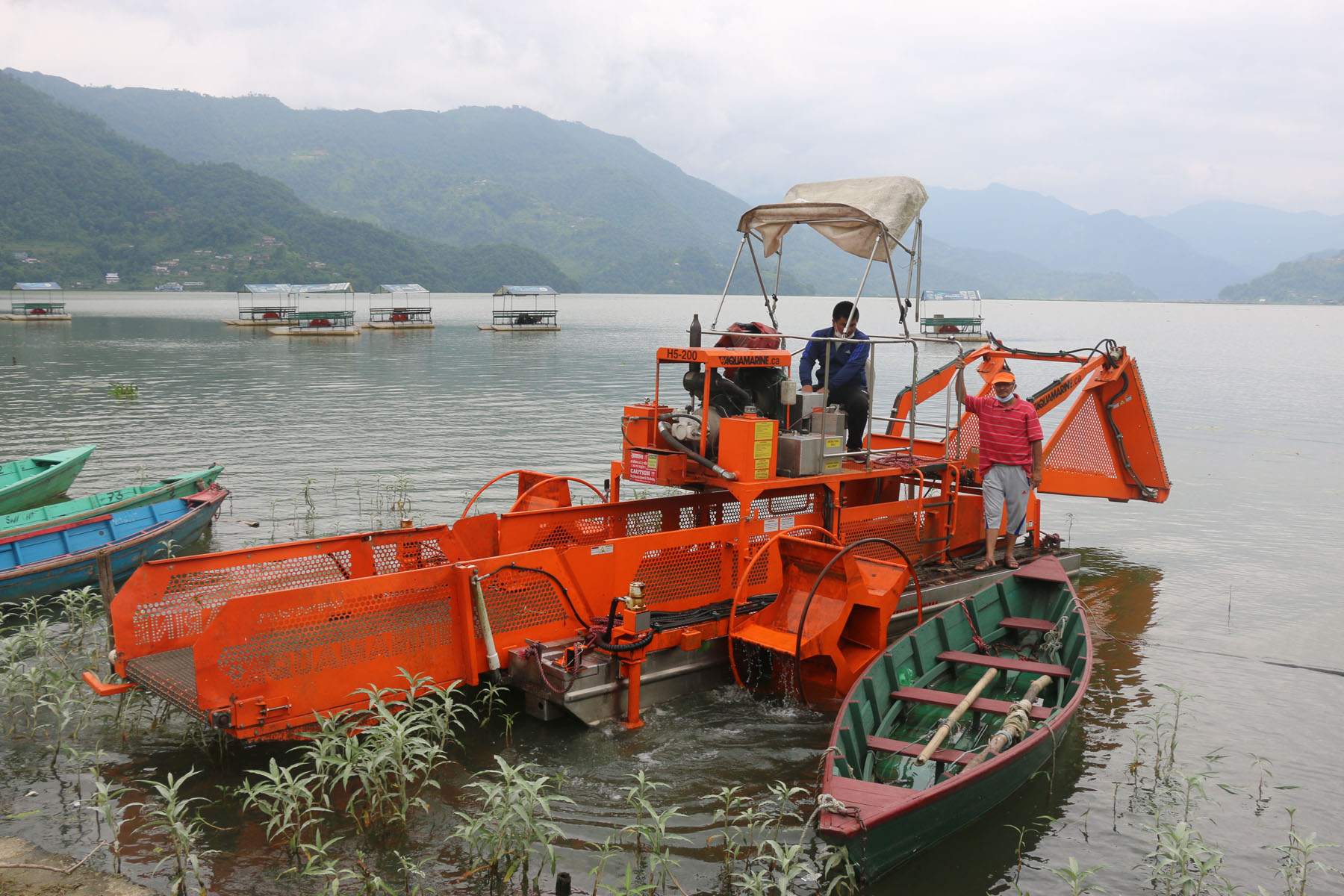 पोखराको फेवातालमा बुधबार मेसिनबाट जलकुम्भी झार निकाल्दै ।