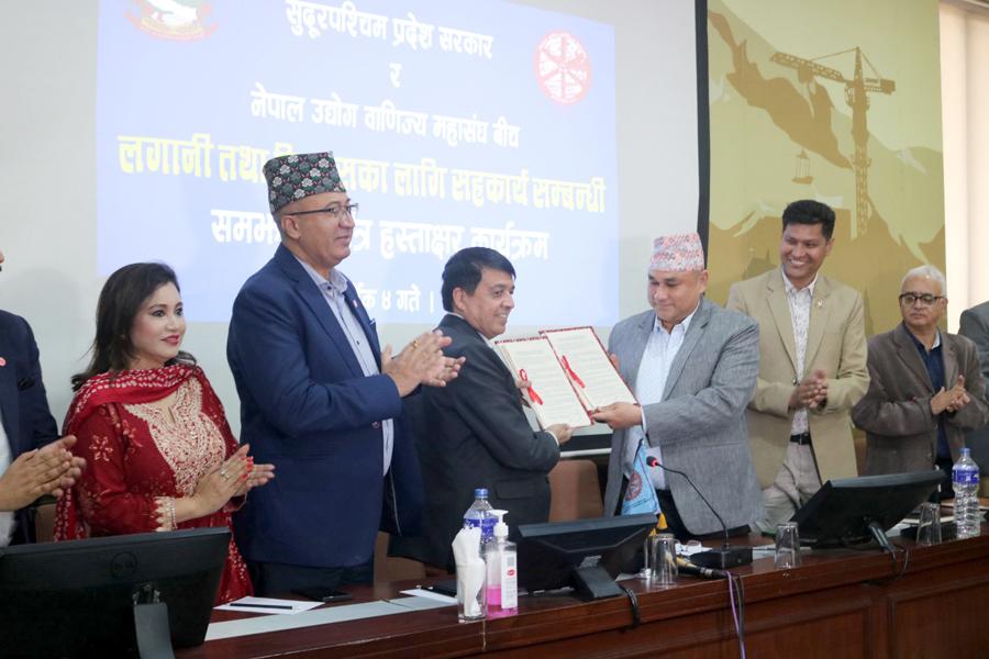 काठमाडौं । सुदुरपश्चिम प्रदेश सरकार र नेपाल उद्योग वाणिज्य महासंघबीच लगानी प्रवर्द्धन र विकासका गतिविधि सञ्चालनका लागि सहकार्य गर्ने विषयमा समझदारी भएको छ । आज महासंघमा आयोजित एक कार्यक्रममा सदुरपश्चिम प्रदेशका मुख्यमन्त्री कमलबहादुर शाह र महासंघका अध्यक्ष चन्द्रप्रसाद ढकालले सझदारीपत्रमा हस्ताक्षर गरेका हुन् ।