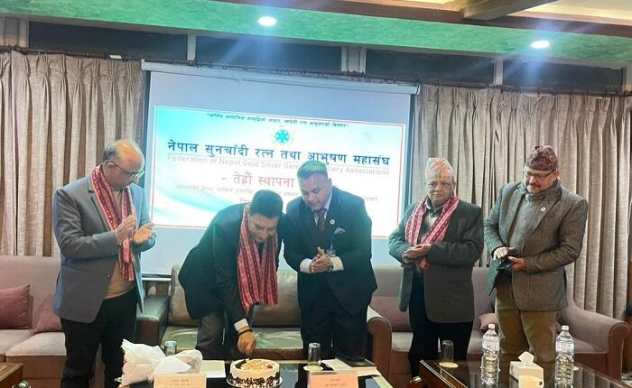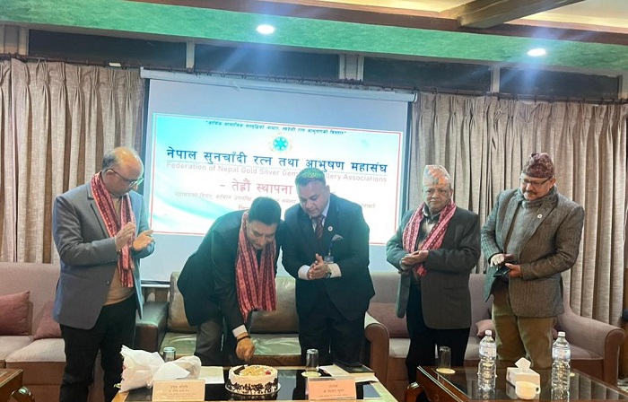 काठमाडौं । नेपाल सुनचाँदी रत्न तथा आभूषण महासंघको १३औँ स्थापना दिवस तथा वार्षिकोत्सव सोमबार सम्पन्न भएको छ । पूर्वमन्त्री तथा महासंघका सल्लाहकार डा. राजेश काजी श्रेष्ठको प्रमुख आतिथ्यतामा आयोजित कार्यक्रममा महासंघको विगत यात्रा, वर्तमान उपलब्धि, आभूषण व्यवसायसँग सम्बन्धित समस्या, चुनौती तथा भावी योजनाबारे व्यापक विचार–विमर्श गरिएको थियो ।