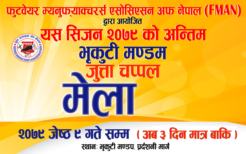 काठमाडौं । काठमाडौंको भृकुटी मण्डपमा जुत्ता चप्पल ब्यापार प्रवर्द्धन मेला जारी छ । फुटवयर म्यानुफ्याक्चरर एसोसियसन अफ नेपालको आयोजनामा वैशाख १५ गतेबाट जारी मेला अन्तिम चरणमा पुगेको छ । मेला जेठ ९ गतेसम्म मात्रै सञ्चालन हुने मेला संयोजक तथा एसोसिएसनका उपाध्यक्ष सुरज बन्जाडेले जानकारी दिए ।