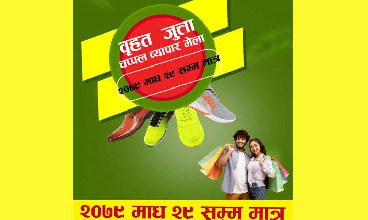 काठमाडौं । काठमाडौंको भृकुटी मण्डपस्थित सानो चौरमा जारी ‘वृहत जुत्ता चप्पल व्यापार मेला’ माघ २९ गतेसम्म मात्रै चल्ने भएकाे छ। जुत्ता चप्पल कम्पनीहरुको संयुक्त आयोजनामा सुरु भएको व्यापार मेला माघ २९ सम्म संचालन हुने आयोजक सबिन कार्कीले बताए ।