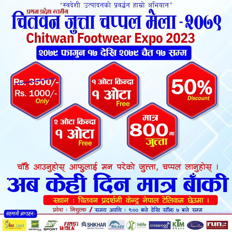 चितवन उद्योग संघ र नेपाल जुत्ता घरको आयोजनामा स्वदेशी जुत्ता चप्पलको प्रवर्द्धन गर्ने लक्ष्यसहित एक्स्पो आयोजना भएको हो । एक्स्पोमा बिएम डियरहिल/बिएफ स्पोर्टस्, शिखर सुज, क्रसरोड, फस्टवाल्क, सुल्याण्ड, रन सुज, भेनस, केटिएम सुज, सिल र हाइलाइफ ब्राण्डको सहभागिता छ ।
