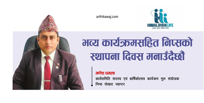 गणेश धमला जीवन बीमा कम्पनीमा बिगत १६ वर्षदेखि निरन्तर सक्रिय छन् । पछिल्लो समय निप्स पोखरा च्याप्टर कार्यसमिति सदस्यमा समेत सक्रिय रहेका उनी निप्सको स्थापना दिवसको अवसरमा आयोजित कार्यक्रमको मूल संयोजकसमेत हुन् । उनी हाल हिमालयन लाइफ इन्स्योरेन्स लिमिटेडको नावय क्षेत्रीय प्रमुख पदमा कार्यरत छन् । धमलासँग निप्सको वार्षिकोत्सव कार्यक्रममा केन्द्रित रहेर गरिएको संक्षिप्त कुराकानी :