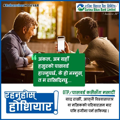 काठमाडौं । राष्ट्रिय स्तरको गरिमा विकास बैंकले समग्र बैकिङ प्रणालीमा बढ्दो Internet Fraud/Phishing बारे जनमानसमा चेतनामूलक सन्देश प्रवाह गर्ने लक्ष्यका साथ आफ्नो सबै सामाजिक संजालबाट एक महिना लामो “रहनुहोस् होसियार” नामक अभियान चलाईरहेको छ ।