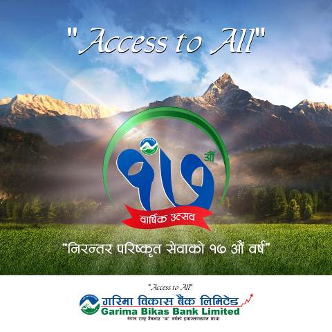 काठमाडौं । ‘Access to All’ मूल नारालाई आत्मसाथ गर्दै ग्राहकमैत्री एवं नविनतम डिजिटल बैकिङ सेवा प्रवाह गर्दै आईरहेको गरिमा विकास बैंक लिमिटेड मंसिर ७ गते बिहीबार १६औं बर्ष पूरा गरि १७औं बसन्तमा प्रवेश गरेको छ । बैंकले यस यात्रामा निरन्तर साथ दिने सेवाग्राही, शेयरधनी महानुभावहरु, नियमनकारी निकायहरु, कर्मचारी तथा शुभेच्छुकहरु प्रति कृतज्ञता प्रकट गरेको छ ।