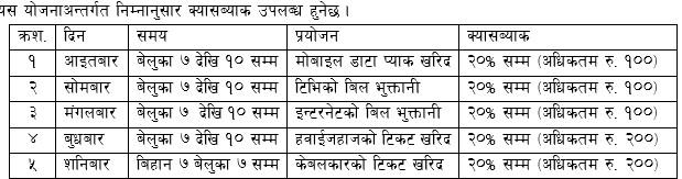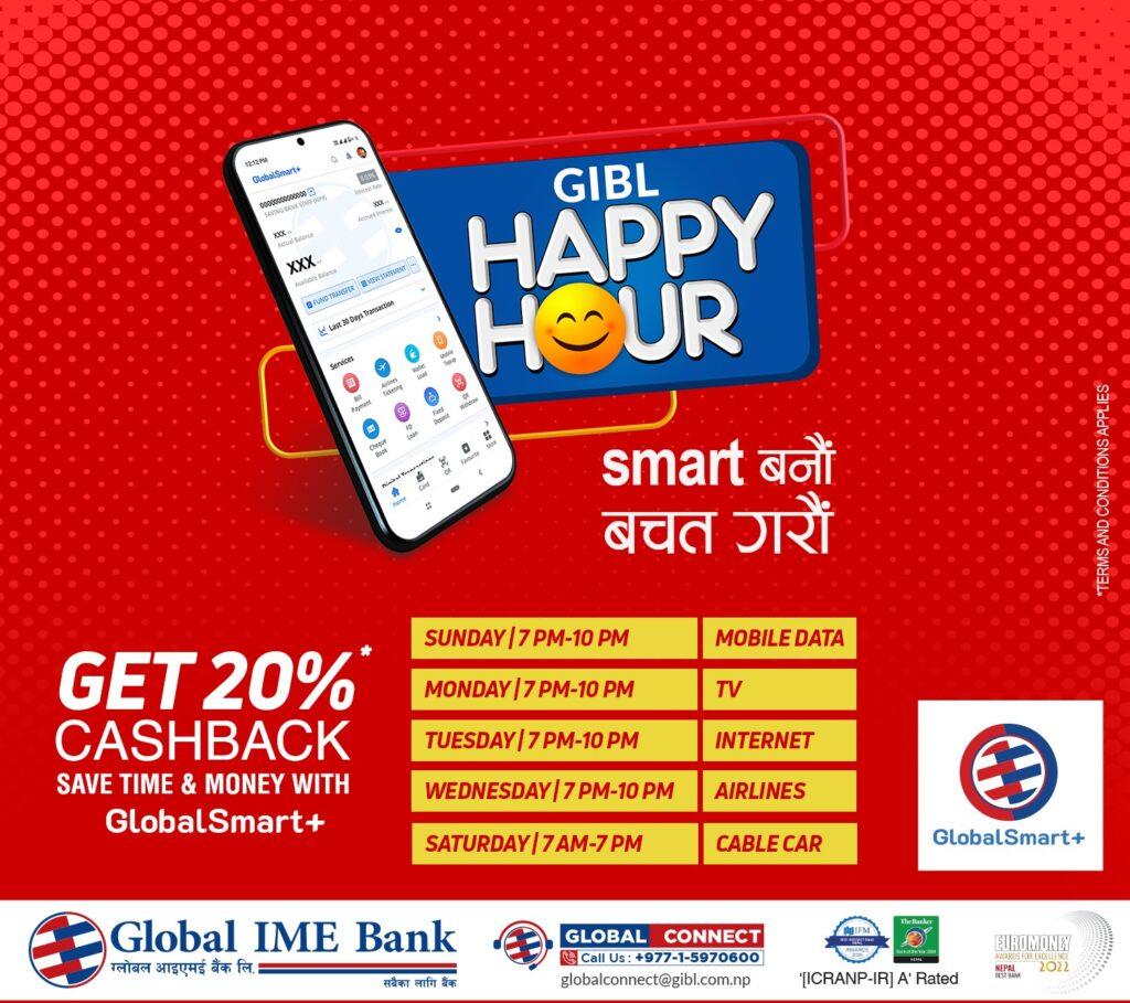 यस हृयाप्पी आवर्स योजनाअन्तर्गत ग्लोबल स्मार्ट प्लसबाट अनलाइन भुक्तानी गर्दा ग्राहकहरुले क्यासब्याक पाउनेछन । आजदेखि २०८० वैशाख १६ गतेसम्म दिन विशेष रुपमा चल्ने यस योजनामा प्रति ग्राहक प्रति दिन एक कारेबारको क्यासब्याकका लागि योग्य हुनेछ । यस योजनाअन्तर्गत निम्नानुसार क्यासब्याक उपलब्ध हुनेछ ।
