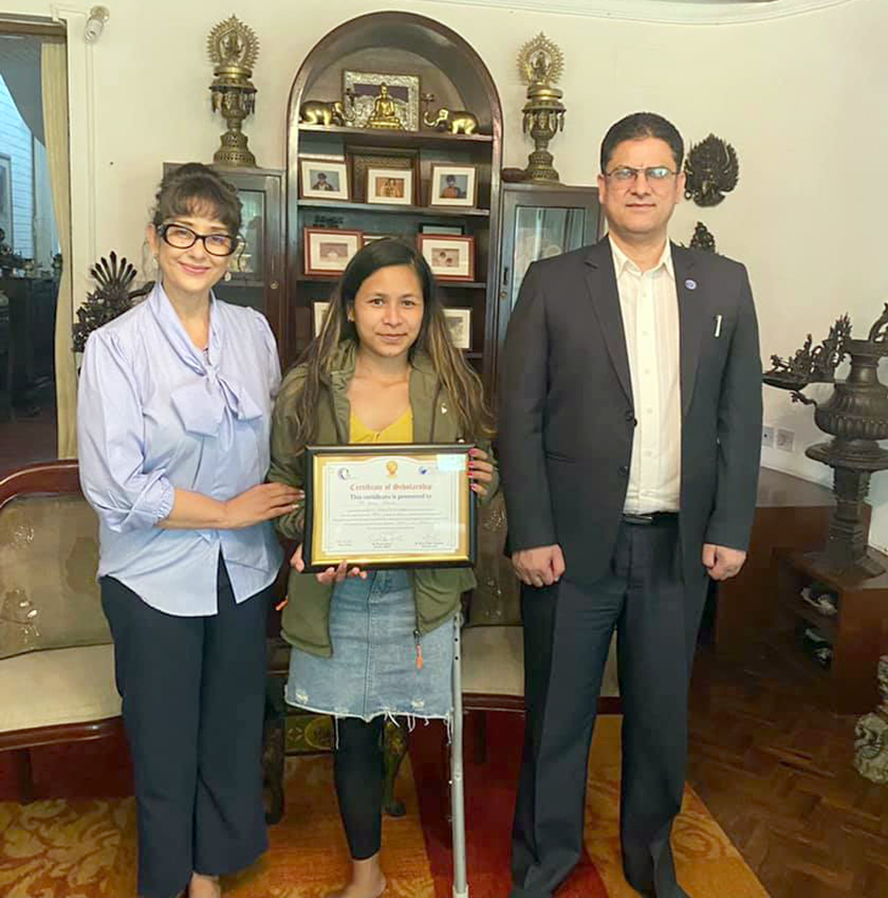 एलिनालाई शुक्रबार अभिनेत्री कोइराला र प्रिन्सिपल ठगुन्नाले छात्रवृत्ती हस्तान्तरण गरेका हुन् । छात्रवृत्ती प्राप्त गर्ने एलिना शारिरीक रुपमा अपाङगता भएपनि अध्ययनमा अब्बल छन् । छात्रवृत्ती प्राप्त गर्दा निकै गौरव महसुस भएको बताउँदै उनले राम्रो अध्ययन गर्ने प्रतिबद्धता व्यक्त गरेकी छन् । छात्रृवत्तीका लागि कलेजले उपयुक्त विद्यार्थी छनोट गर्न सफल भएको उक्त अवसरमा बोल्दै अभिनेत्री कोइरालाले बताइन् ।