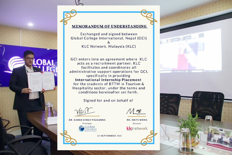 काठमाडौं । काठमाडौंको मध्य बानेश्वरमा रहेको ग्लोबल कलेज इन्टरनेशनल र मलेसियाको केएलसी नेटवर्कबीच सहकार्य भएको छ । आइतबार भर्चुअल कार्यक्रमबीच दुई पक्षबीच सहकार्य गर्ने विषयमा सम्झौता भएको छ ।