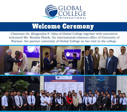 काठमाडौं । इन्टरनेशनल रिलेसन्स अफिस अफ युनिभर्सिटी अफ वार्साकी मोनिका प्लेटेकलाई ग्लोबल कलेज इन्टरनेशनलमा स्वागत गरिएको छ ।