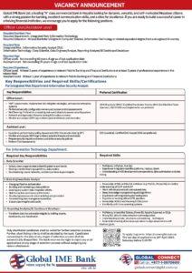 काठमाडौं । ग्लोबल आइएमई बैंकले विभिन्न पदका लागि कर्मचारी माग गरेको छ । बैंकले अफिसर लेभल र असिस्टेन्ट लेभलका लागि कर्मचारी माग गरेको हो ।