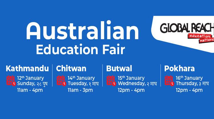 काठमाडौं । ग्लोबल रिच एजुकेशन कन्सल्टेन्सीले नेपालको मुख्य कार्यालय डिल्लीबजारसहित चितवन, बुटवल र पोखरा शाखामा ‘अष्ट्रेलियन एजुकेशन फेयर’को घोषणा गरेको छ । काठमाडौं शाखामा आगामी १२ जनवरी (पुस २८) मा फेयर हुनेछ ।
