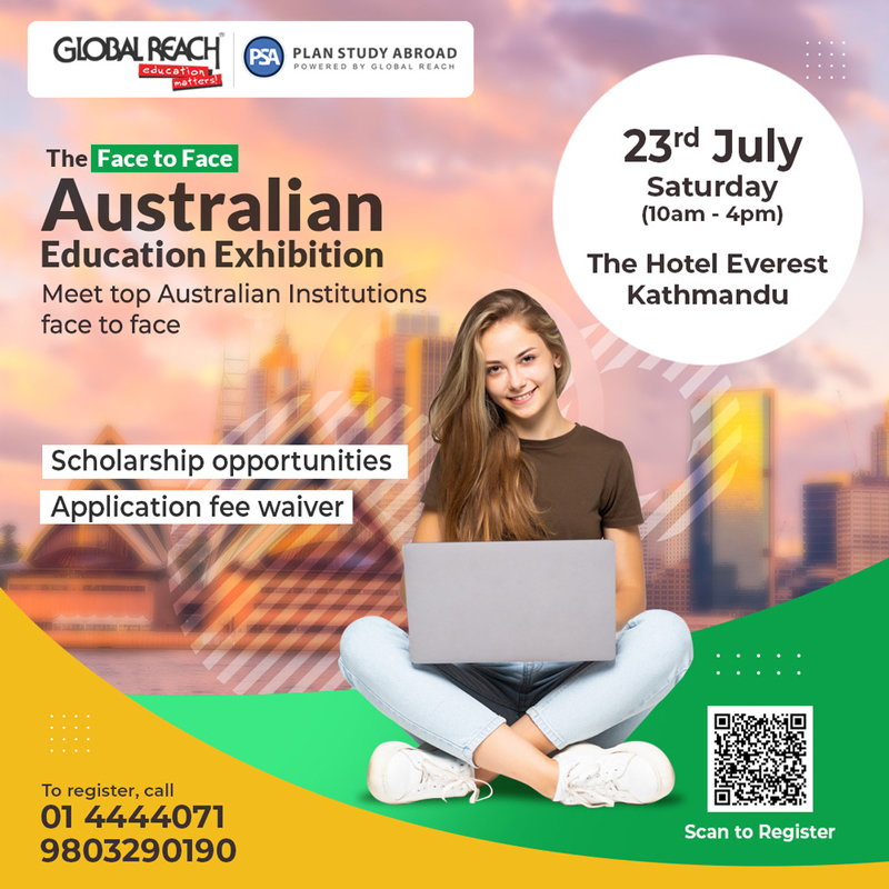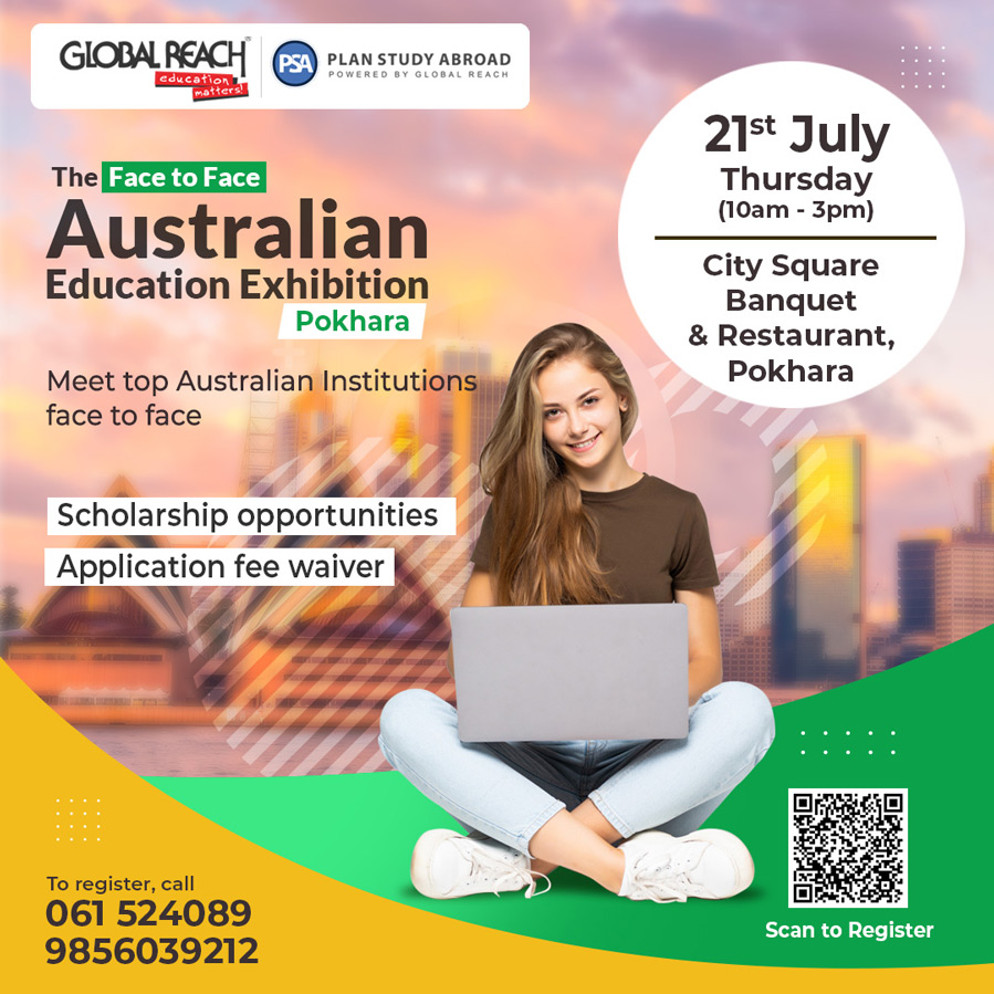 काठमाडौं । ग्लोबल रिचको आयोजनामा नेपालका विभिन्न सहरमा अष्ट्रेलियन एजुकेशन एक्जिव्यूसन हुने भएको छ । उच्च शिक्षा अध्ययनका लागि अष्ट्रेलिया जान चाहने विद्यार्थीलाई मध्यनजर गर्दै एक्जिव्युसनको आयोजना गर्न लागिएको हो ।