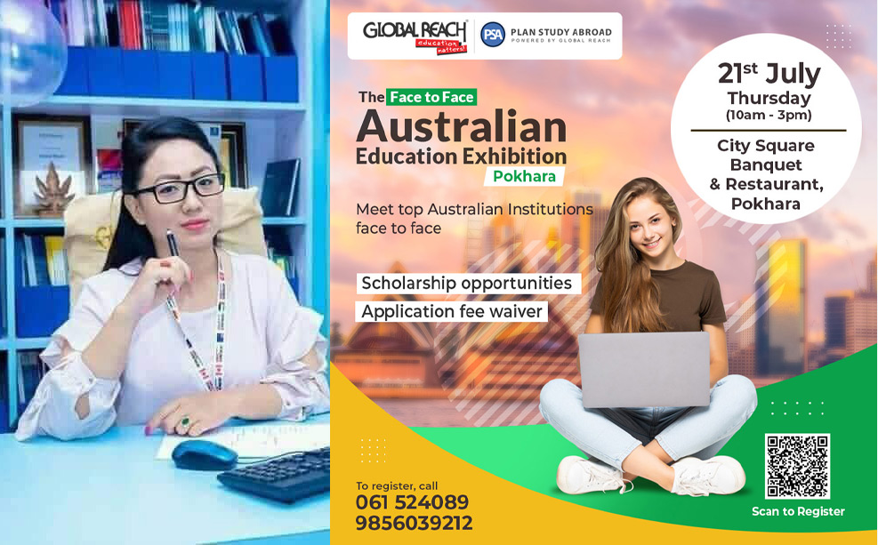 पोखरा । ग्लोबल रिच पोखरा शाखाको आयोजनामा पोखरामा अष्ट्रेलियन एजुकेशन एक्जिव्युसन हुने भएको छ । पोखराको न्यूरोडमा रहेको सिटी स्क्वायर बैंक्युटमा जुलाई २१ मा एक्जिव्युसन हुने शाखा को-अर्डिनेटर सरिता गुरुङले जानकारी दिइन् ।