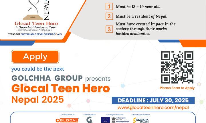 गोल्छा ग्रुपद्वारा प्रस्तुत ग्लोकल टीन हिरो नेपाल २०२५ को ११ औं संस्करणका लागि आवेदन खुल्ला गरिएको छ । यो प्रतिष्ठित कार्यक्रमले नेपालका किशोरकिशोरीहरूलाई उनीहरूको असाधारण योगदान र नेतृत्वका लागि सम्मान गर्ने लक्ष्य राखेको छ ।