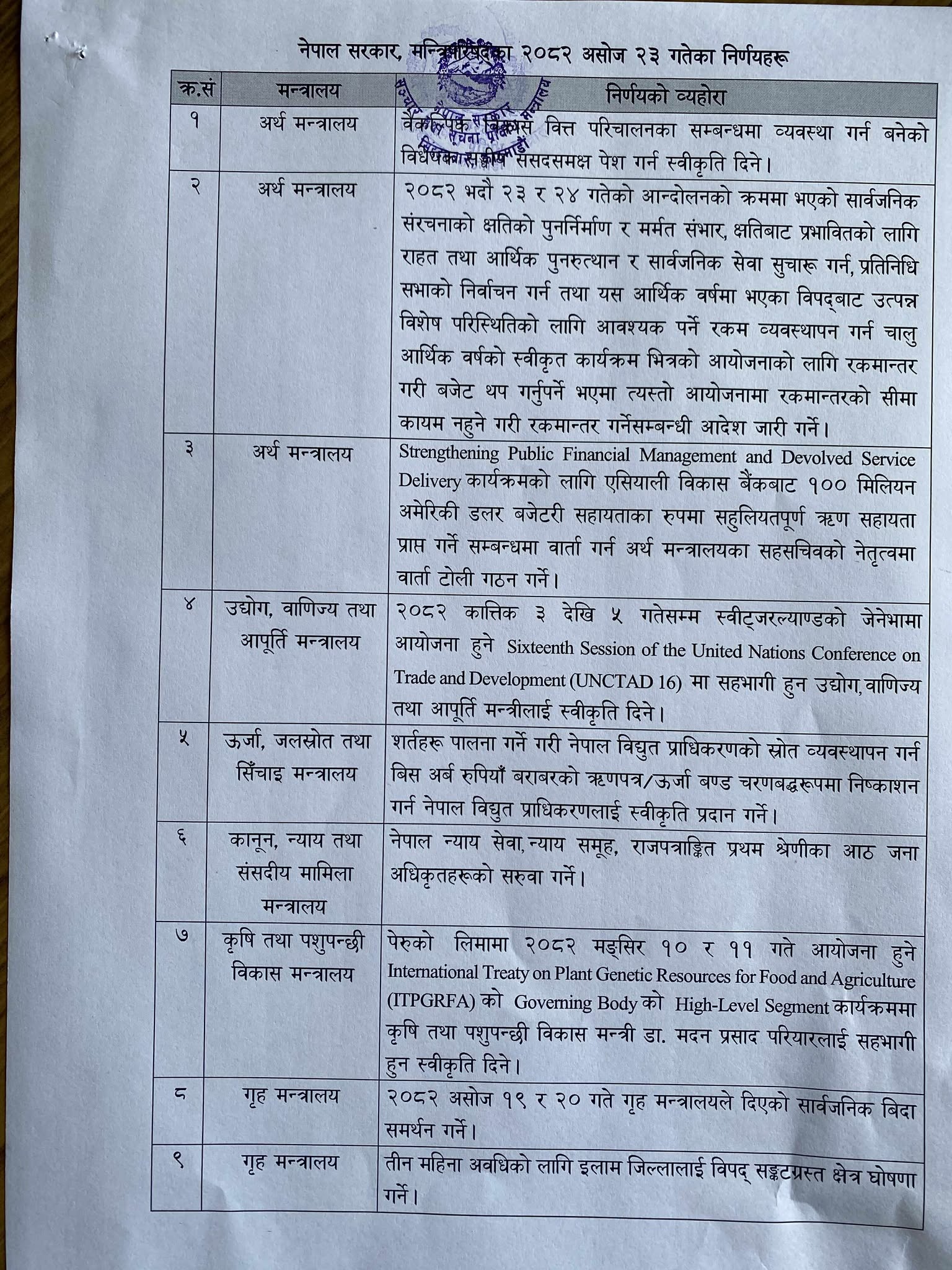 मन्त्रिपरिषद् बैठकले भदौ २३ र २४ गतेको आन्दोलनको क्रममा भएको सार्वजनिक संरचनाको क्षतिको पुन:निर्माण र मर्मत संभार, क्षतिबाट प्रभावितको लागि राहत तथा आर्थिक पुन:उत्थान र सार्वजनिक सेवा सुचारु गर्न, प्रतिनिधि सभाको निर्वाचन गर्न तथा यस आर्थिक वर्षमा भएका विपदबाट उत्पन्न विशेष परिस्थितिको लागि आवश्यक पर्ने रकम व्यवस्थापन गर्न चालु आर्थिक वर्षको स्वीकृत कार्यक्रम भित्रको आयोजनाका लागि रकमान्तर गरी बजेट थप गर्नुपर्ने भएमा त्यस्तो आयोजनामा रकमान्तरको सीमा कायम नहुने गरी रकमान्तर गर्नेसम्बन्धी आदेश जारी गर्ने निर्णय गरेको छ।