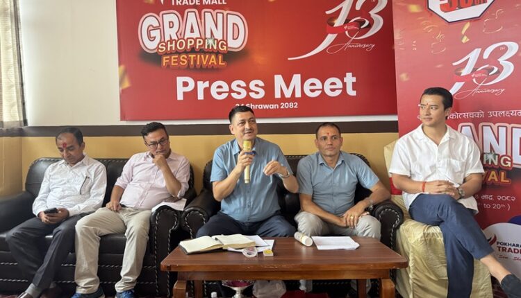 पोखरा । चिप्लेढुंगामा रहेको पोखरा ट्रेड मल एन्ड हाउजिङ प्रालिले आफ्नो १३ औं वार्षिकोत्सवको अवसरमा ‘ग्रान्ड सपिङ फेस्टिभल’ योजना ल्याएको छ । साउन २५ देखि भदौ ४ सम्म यो योजना सञ्चालन हुने । यस अवधिमा टे«ड मलमा रहेका व्यावसायिक प्रतिष्ठानबाट ग्राहकले ५० प्रतिशतसम्म छुट पाउने छन् ।