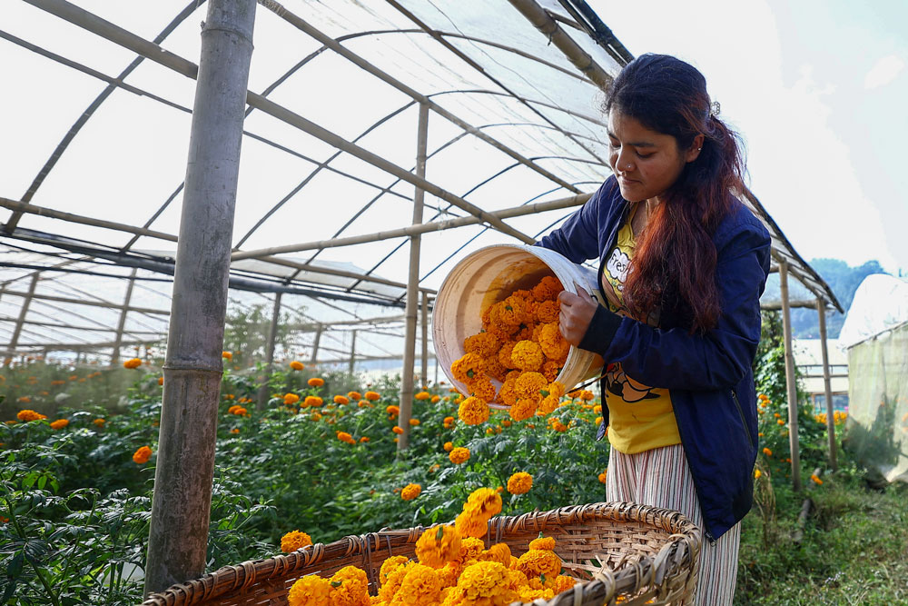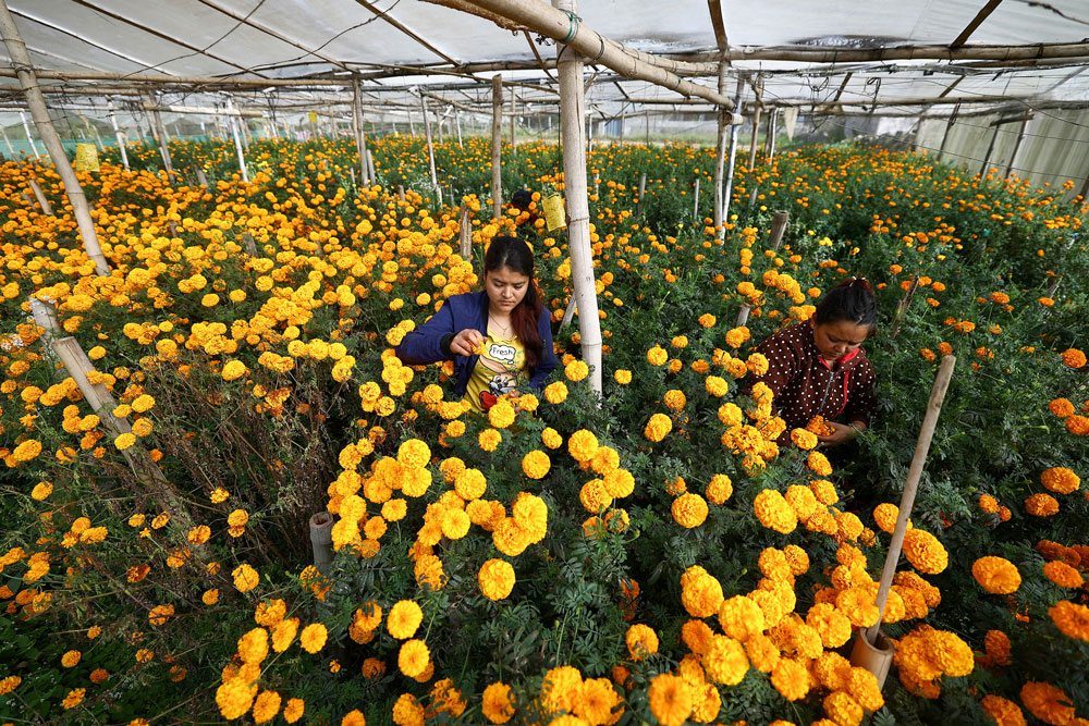 काठमाडौं । भक्तपुरको गुन्डुमा बुधबार कृषक तिहारका लागि मखमली फूल टिप्दै छन् । गत वर्षभन्दा यस वर्ष फूलको व्यापार राम्रो रहेको कृषक बताउँछन् । तस्बिर ः रोशन सापकोटा, रासस