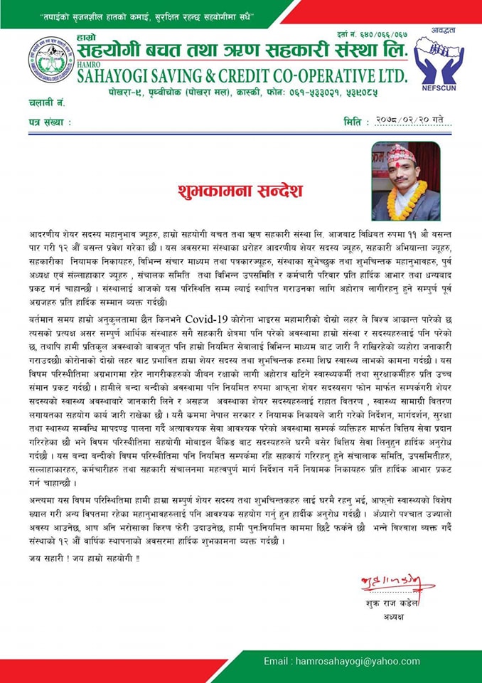 पोखरा । पोखरामा रहेको हाम्रो सहयोगी बचत तथा ऋण सहकारी संस्था लि.१२ औं बर्षमा प्रवेश गरेको छ । वार्षिकोत्सवको अवसरमा सहकारीले शुभकामना सन्देशमार्फत सम्पूर्ण सल्लाहकार, पूर्व अध्यक्ष, शेयर सदस्य, कर्मचारी, संचालक समिति, शुभचिन्तक तथा शुभेच्छुकलाई शुभकामना व्यक्त गरेको छ ।