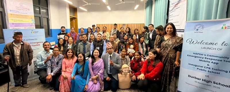 काठमाडौं । हाप्सा नेपालले दरबार हाई स्कुल, रानीपोखरीमा पहिलोपटक शिक्षक तथा विद्यार्थीलाई सिपीआर र चोकिंग प्राथमिक उपचार तालिम प्रदान गर्दै कम्युनिटी इमर्जेन्सी रेस्पोन्स टुलकिट (CERT) मोबाइल एपको उद्घाटन गरेको छ ।