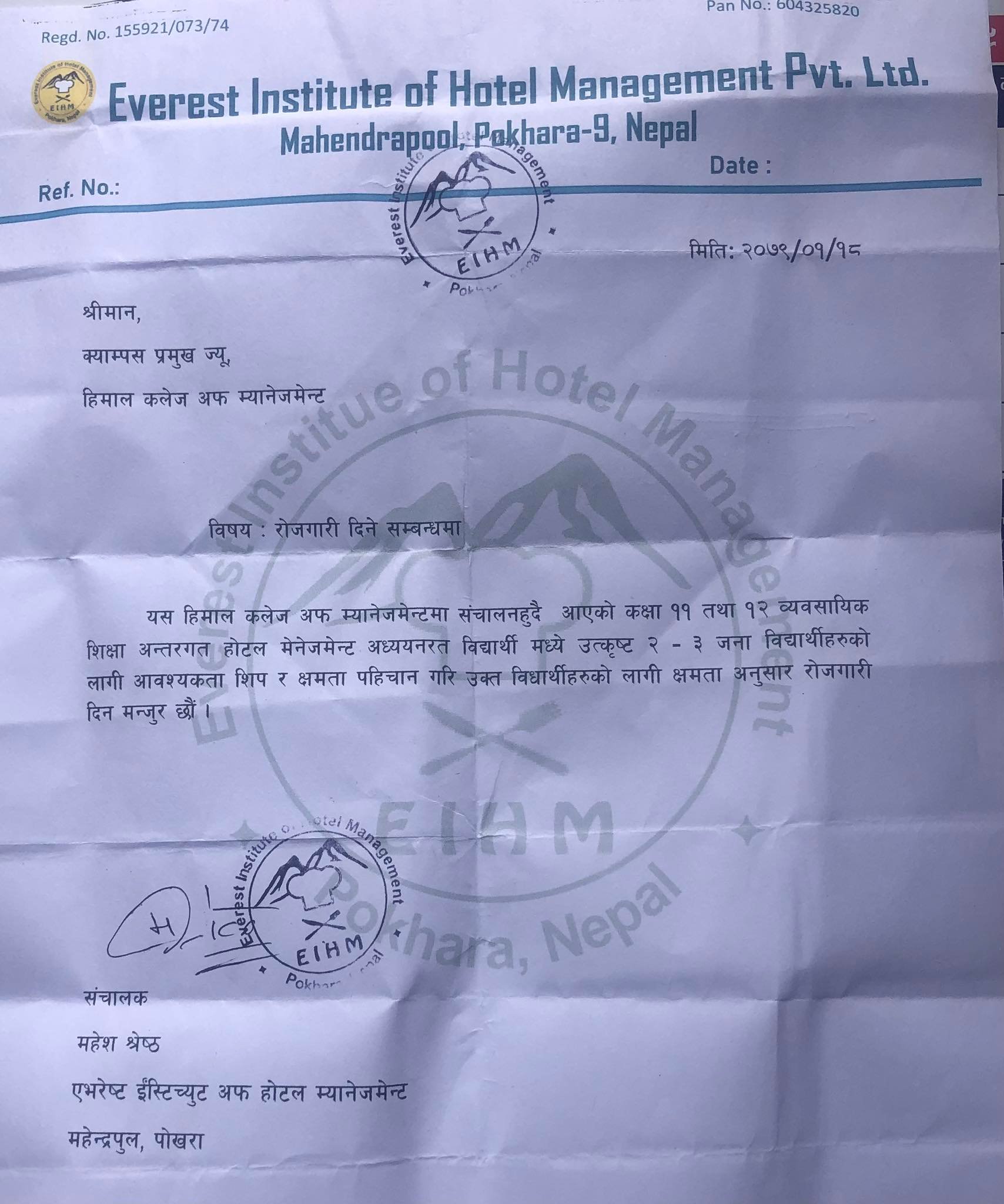 पोखराको महेन्द्रपुलमा रहेको एभरेष्ट इष्टिच्युट अफ होटल म्यानेजम्यान्टले कलेजका होटल म्यानेजम्यान्टमा अध्ययनरत विद्यार्थीहरुमध्ये उत्कृष्ट २/३ जनालाई उनिहरुको आवश्यकता, शिप र क्षमताअनुसार रोजगारी प्रदान गर्ने संचालक महेश श्रेष्ठले जानकारी दिए ।