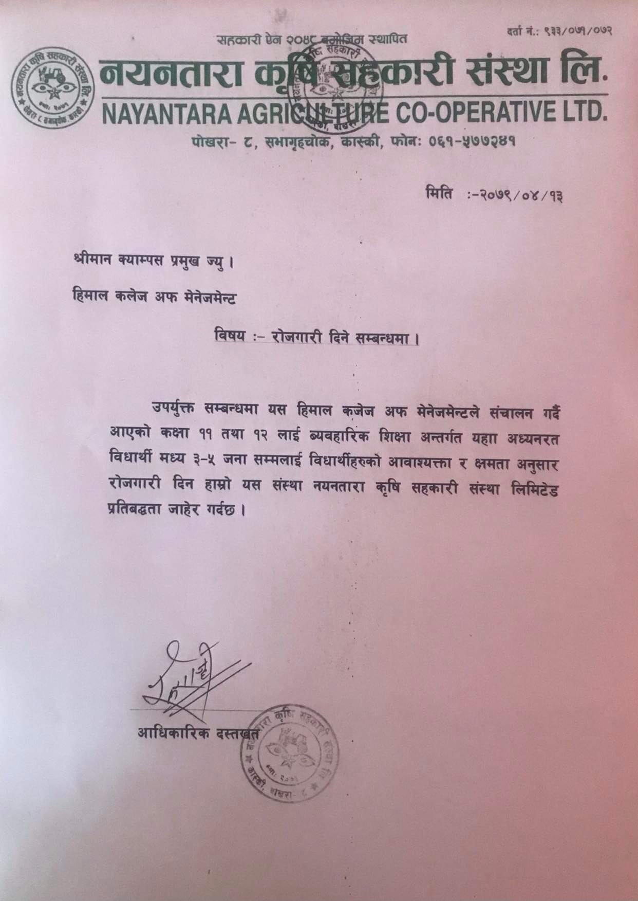 त्यस्तै, नयनतारा कृषि सहकारी संस्था लि.ले पनि ३/५ विद्याथीलाई उनिहरुको आवश्यकता, शिप र क्षमताअनुसार रोजगारी प्रदान गर्ने भएको छ ।