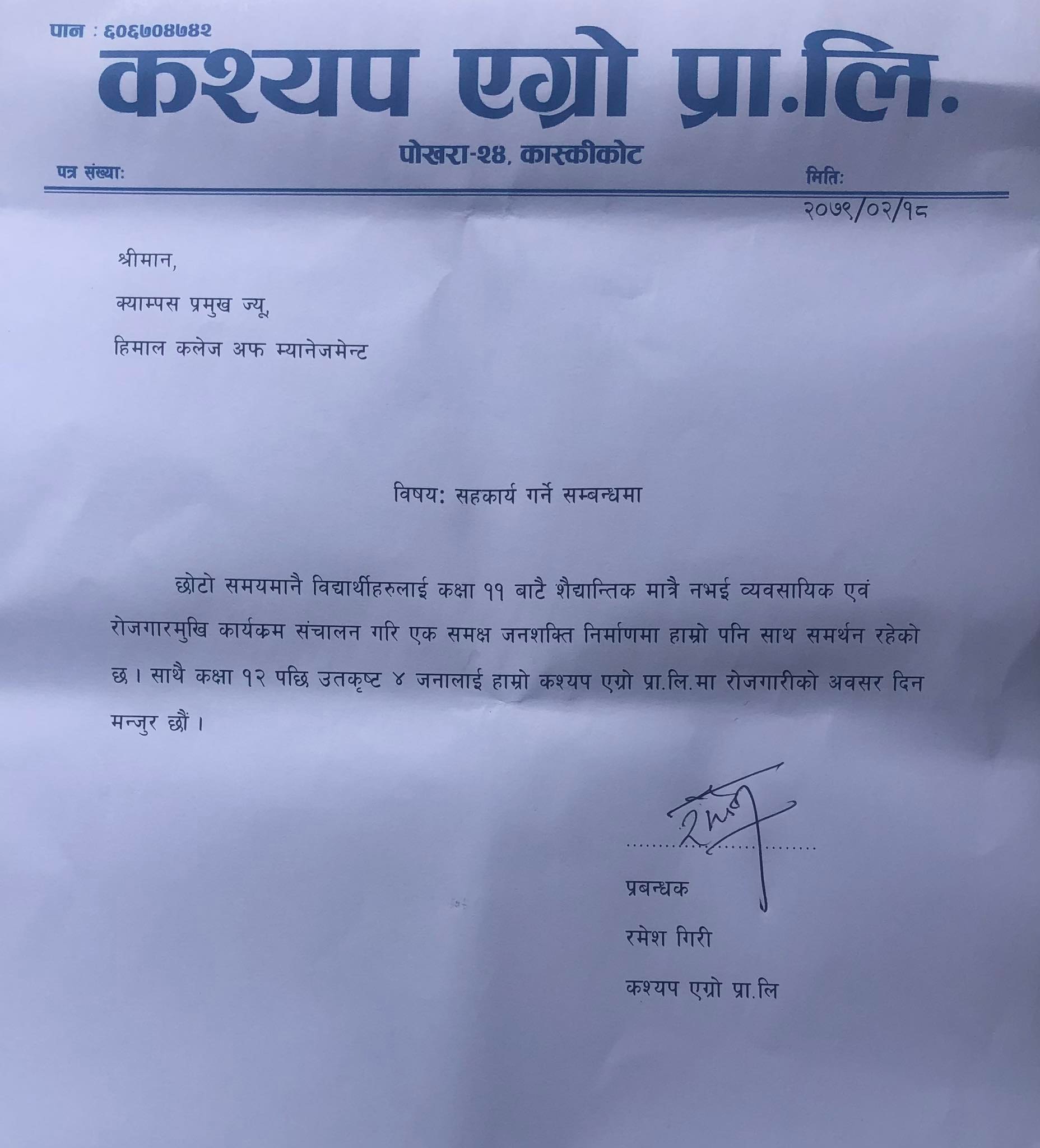 त्यस्तै, पोखरा–२४ कास्कीकोटमा रहेको कश्यप एग्रो प्रा.लि ले पनि कलेजका होटल म्यानेजम्यान्टमा अध्ययनरत विद्यार्थीलाई रोजगारी दिने भएको छ । प्रा.लि ले कक्षा १२ मा उत्कृष्ट ४ जना विद्यार्थीलाई रोजगारीको अवसर प्रदान गर्ने प्रबन्धक रमेश गिरीले जानकारी दिए ।
