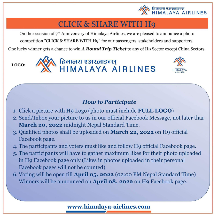 - एच९ (हिमालय एअरलाइन्सको लोगो) सहित फोटो खिच्ने। फोटोमा एच९ लोगो पूर्ण रुपमा देखिनु पर्नेछ