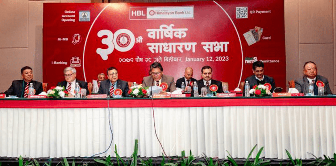 काठमाडौं । हिमालयन बैंक लिमिटेडको ३० औँ वार्षिक साधारण सभाले १९.११ प्रतिशत लाभांशको प्रस्ताव पारित भएको छ ।