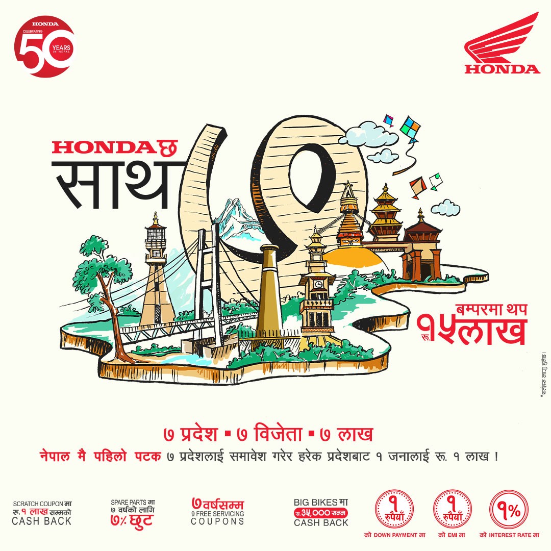 यस योजनाको समय अविधि भर होण्डाका ग्राहकहरुले स्क्रयच कुपन मार्फत हात खाली नजाने गरी १ लाखसम्म नगद उपहार प्राप्त गर्नेछन् । यसका साथै यस योजना अन्तर्गत ग्राहकहरुले, ७ वर्षको लागि स्पेयर पार्टस्मा ७% छुट, ७ वर्षसम्मका लागि ९ वटा बोनस सर्भिस कुपन प्राप्त गर्न सक्नेछन् । त्यसैगरी होण्डा बिग बाइकको खरिदमा ४० हजार रुपैया सम्मको क्यास ब्याक पाउन सक्नेछन् । यति मात्र नभई यस योजनामा तपाईंहरुले मात्र १ रुपैयाँको डाउन पेमेन्ट, १ रुपैयाँको इएमआइ र १% ब्याजदरमा समेत होण्डा खरिद गर्न सक्नेछन् ।