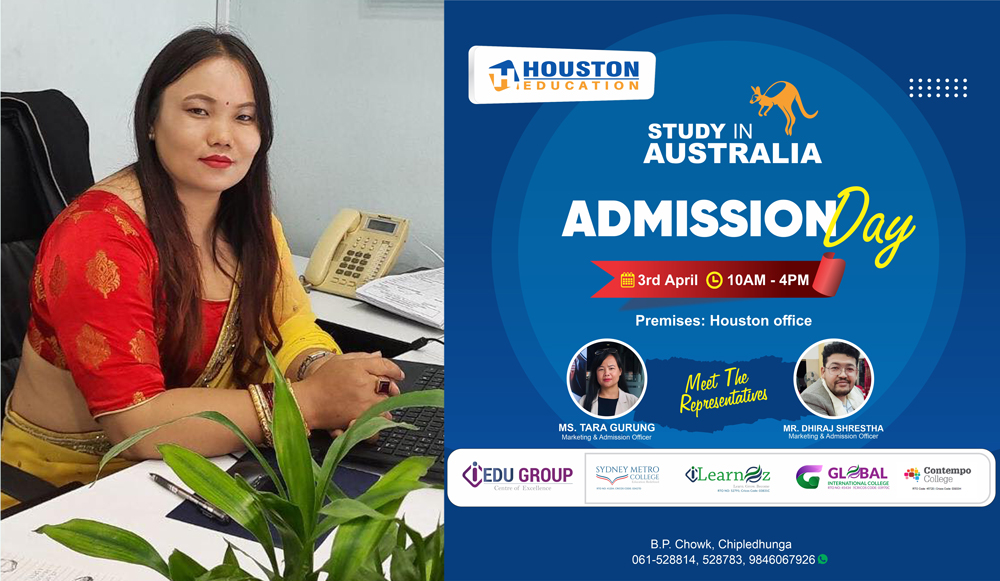 पोखरा । ह्युस्टन एजुकेसन पोखराको आयोजनामा ‘स्टडी इन अष्ट्रेलिया एडमिसन डे’ हुने भएको छ । ह्युस्टनको कार्यालय बिपीचोक चिप्लेढुंगामा अप्रिल ३ (चैत २०) आइतबार कार्यक्रम हुने प्रवन्ध निर्देशक पवित्रा थापाले जानकारी दिइन् । उच्च शिक्षा अध्ययनका लागि अष्टे«लिया जान चाहने विद्यार्थीलाई लक्षित गरी एडमिसन डे आयोजना गरिएको हो ।