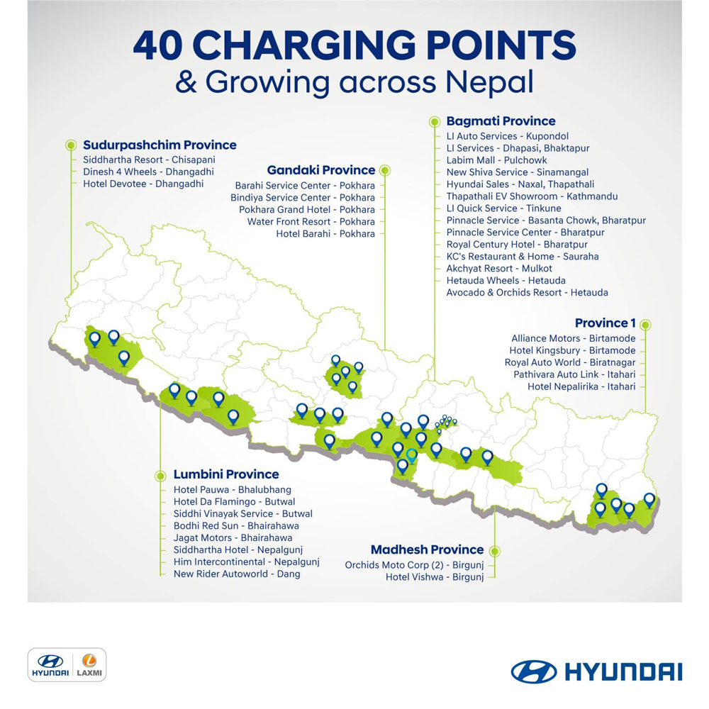 हुन्डाईको इलेक्ट्रिक गाडी चढ्ने ग्राहकहरुलाई उत्कृष्ट अनुभव प्रदान गर्न र लामो दुरीको यात्रा पनि इलेक्ट्रिकमा गर्न सक्ने बनाउन देशका विभिन्न स्थानमा चार्जिङ स्टेशनहरु स्थापना गर्दै आएको हो । नेपालको सबै हाइवे र स्थानीय रुटहरुमा पेट्रोल पम्पको एथेस्ट उपलब्धता भएता पनि इभी चार्जिङ पोइन्ट नभएकोले नै कम्पनीले क्रमिकरुपमा चार्जिङ नेटवर्क विस्तार गर्दै गएको हो ।