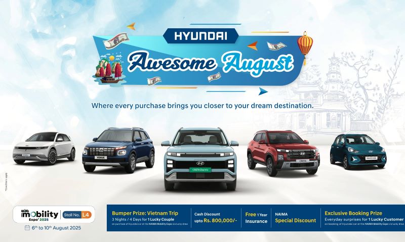 काठमाडौं । नेपालमा हुन्डाई गाडीको आधिकारिक वितरक लक्ष्मी इन्टरकन्टिनेन्टल प्रालिले ‘Hyundai Awesome August’ योजना सुरु गरेको छ । यही साउन २१ देखि २५ गतेसम्म सञ्चालन हुने यस योजना काठमाडौंको भृकुटीमण्डपमा आयोजना भइरहेको नाइमा मोबिलिटी एक्स्पो २०८२ सँगै सञ्चालन हुनेछ ।