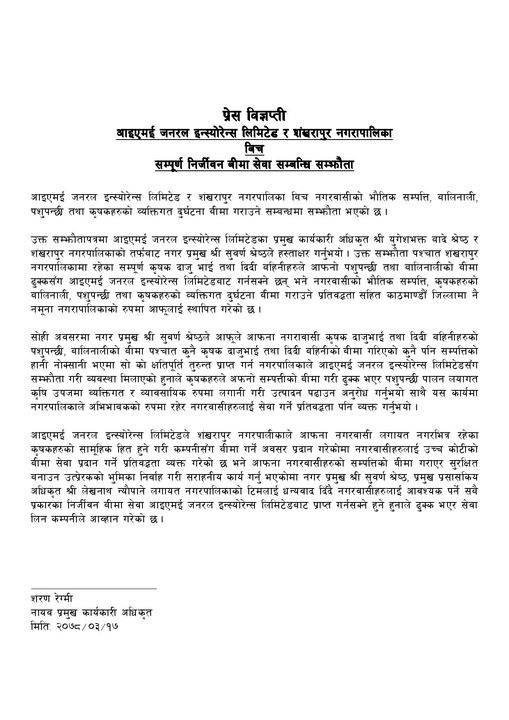 सम्झौतापत्रमा आइएमई जनरल इन्स्योरेन्स लिमिटेडका प्रमुख कार्यकारी अधिकृत युगेशभक्त बादे श्रेष्ठ र शंखरापुर नगरपालिकाको तर्फबाट नगर प्रमुख सुवर्ण श्रेष्ठले हस्ताक्षर गरेका छन् । उक्त सम्झौता पश्चात शंखरापुर नगरपालिकामा रहेका सम्पूर्ण कृषक दाजु भाई तथा दिदी बहिनीहरुले आफनो पशुपन्छी तथा बालिनालीको बीमा ढुक्कसँग आइएमई जनरल इन्स्योरेन्स लिमिटेडबाट गर्नसक्ने छन् भने नगरवासीको भौतिक सम्पत्ति, कृषकहरुको बालिनाली, पशुपन्छी तथा कृषकहरुको व्यक्तिगत दुर्घटना बीमा गराउने प्रतिवद्धता सहित काठमाण्डौं जिल्लामा नै नमूना नगरापालिकाको रुपमा आफूलाई स्थापित गरेको छ ।