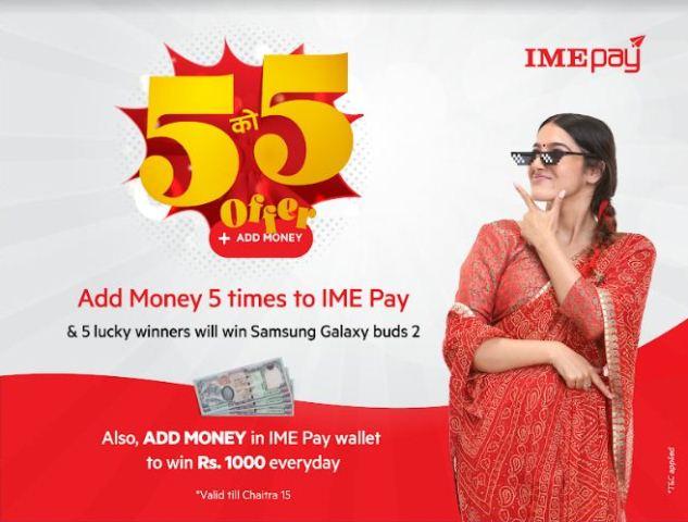 चैत्र १ देखि १५ गते सम्म चल्ने यस अफरमा ग्राहकहरुले विभिन्न माध्यम, जस्तै लिन्क गरेको बैंकको खाताबाट, एम–बैन्किङ वा इ–बैकिङबाट, डेबिट/क्रेडिट कार्डबाट रेमिट्यान्स प्राप्त गर्दा र आइएमई पे वालेटबाट आइएमई पे वालेटमा कम्तिमा ५ पटक पैसा लोड गर्दा ५ जना भाग्यशाली विजेताहरुले सामसुंंग ग्यालेक्सी बड्स २ जित्ने मौका पाउने छन् । यसका साथै, हरेक दिन कम्तिमा १ पटक सोहि माध्यमहरुबाट आइएमई पे वालेटमा पैसा लोड गर्दा १ जना भाग्यशाली विजेताले रु. १००० जित्ने मौका पनि पाउनेछन् । सो रकम विजेताको वालेटमा लोड हुनेछ ।