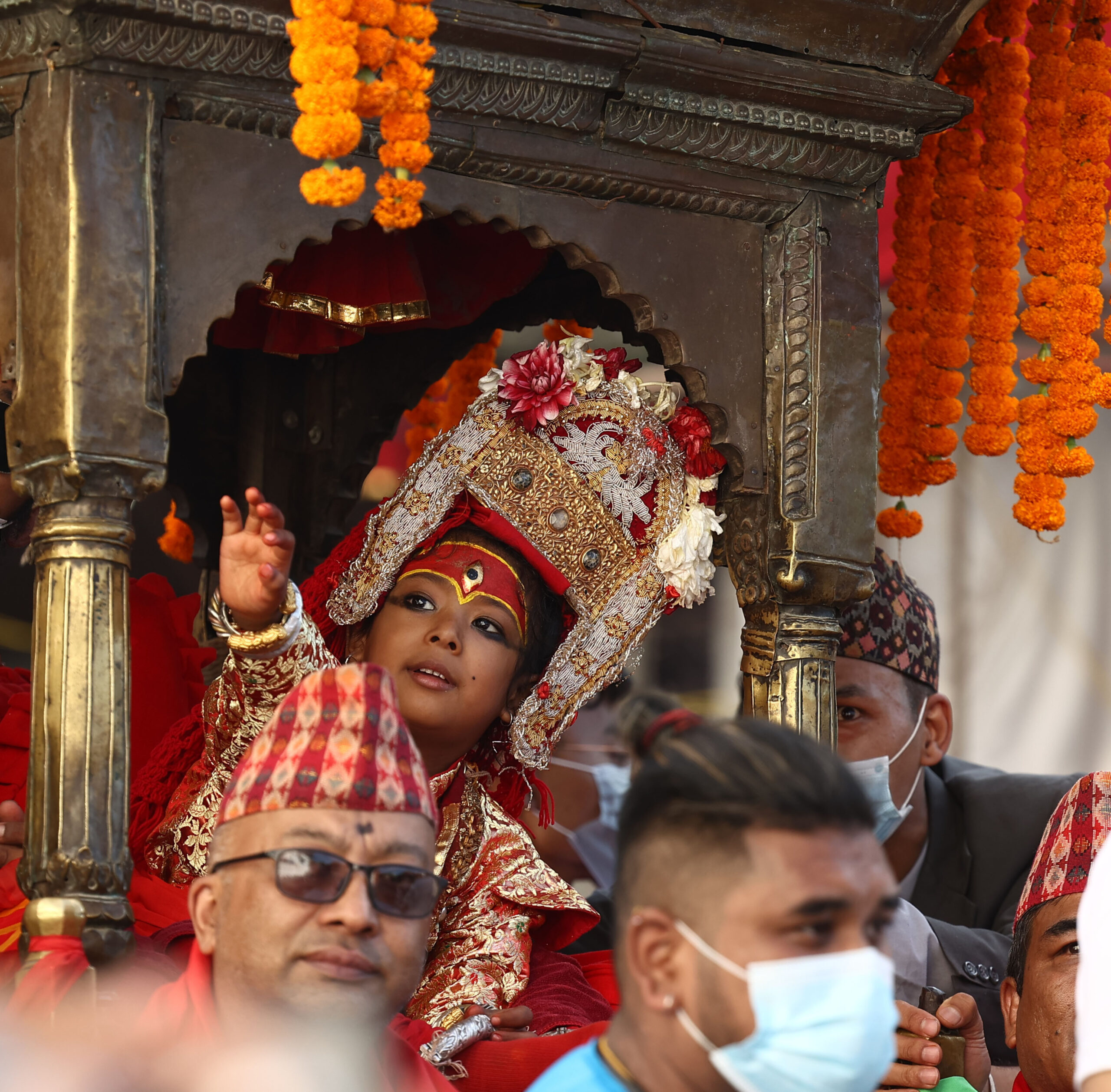 ईन्द्रजात्राको अवसरमा बसन्तपुरमा आयोजित विशेष समारोहमा सहभागी गराइएको जीवित देवी कुमारी ।
