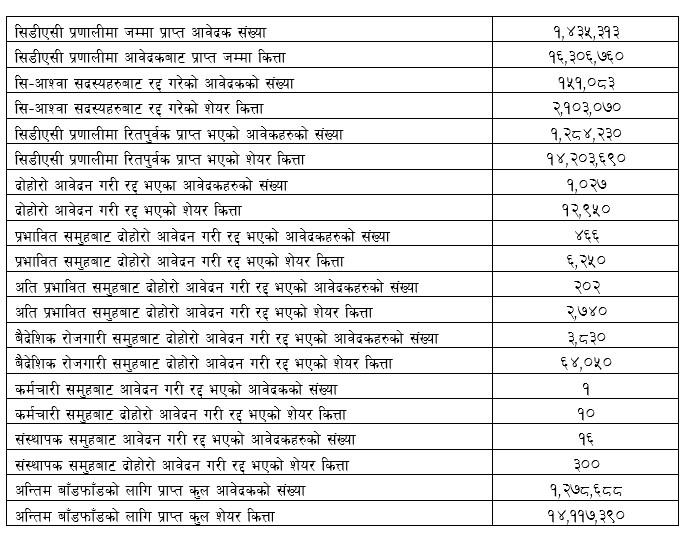 उक्त कम्पनीको आइपीओ एक लाख ९९ हजार २०० जनाले १० कित्ताका दरले १९ लाख ९२ हजार कित्ता आइपीओ प्राप्त गरेका छन् । यसमा कुल १४ लाख ३५ हजार ३१३ जनाले आवेदन दिएका थिए ।